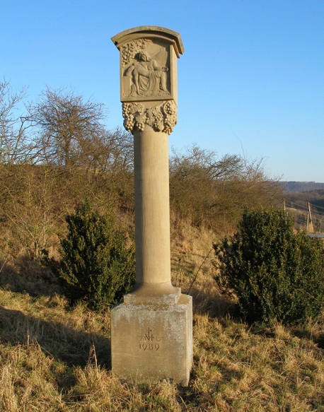 Farn vom Dörf, in stiller Flur, wu zwä Faldwaach grood si traffn, stäeht a Marterla allee, vo em biedern Steemetz gschaffn. Ner a willer Roesestouk töet ümrank dös fromma Steemal: alt, verwittert vo der Zeit. Die Schrift dezu und Jahreszahl. Vorn oom drauf im Bildaufsatz hält die Muettergottes schmarzhaft auf ihr Kniea ihrn liebn Suh, vom Leidn müed, toedwund erschlafft. Söll a Guettäter gstift hoo, daar viel Lädn hat dörchstäeh möeß. Vo ra hat die Hilf erbatt, dankbar gedankt miet steenerm Grueß. Sinned stäeh i da, betracht dös Marterla im Ackerland. Send en Grueß der Muetter nauf und em Stifter ubekannt. Hörbeispiel "Es Marterla" |